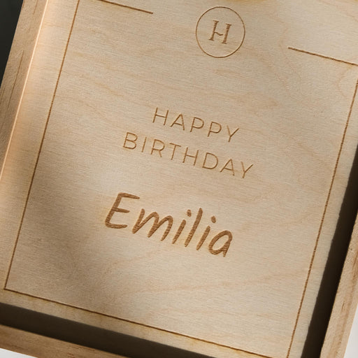 Die Geschenkbox wird mit einer persönlichen Gravur versehen: Auf dem Deckel steht „Happy Birthday [Name des Geburtsamtskindes]“ – so wird jedes Set...