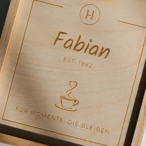 Die Geschenkbox wird mit einer persönlichen Gravur versehen: Auf dem Deckel steht „KEIN TAG OHNE KAFFEE, KEIN KAFFEE OHNE [Name]“ – so wird jedes S...
