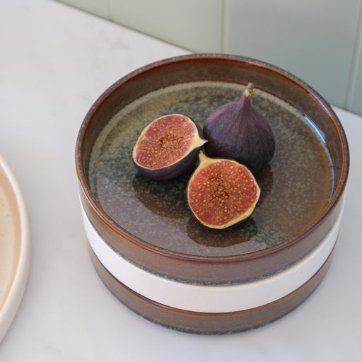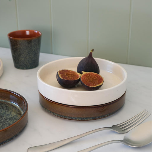 Flacher Teller mit hohem Rand und mit 13cm Durchmesser aus der Kollektion Redonda. Der Teller 13cm aus der Kollektion kann als Deckel genutzt werden.