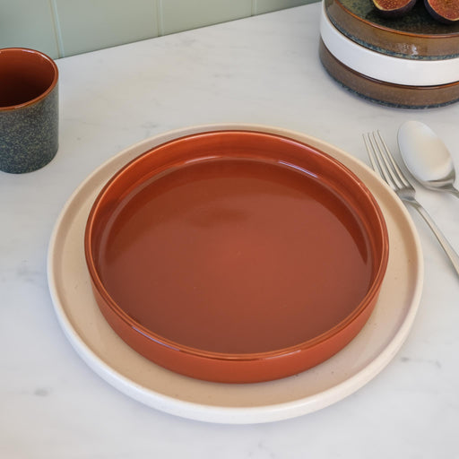 Dieser flache Teller mit hohem Rand aus Porzellan besitzt 21cm Durchmesser. In der schönen Farbe Kupferrot eine wundervolle, farbliche Abwechslung....